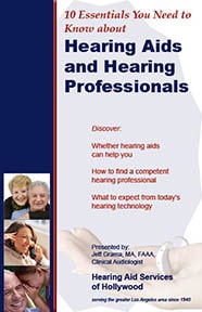 Read “Ten Essentials You Need to Understand about Hearing Aids and Hearing Professionals”This valuable report will inform you how to choose a competent hearing professional, what you can expect on your initial visit and how to ensure you will receive maximum benefit from the hearing aids you purchase. Whether you live in Southern California or thousands of miles from our office, reading this report is a must.